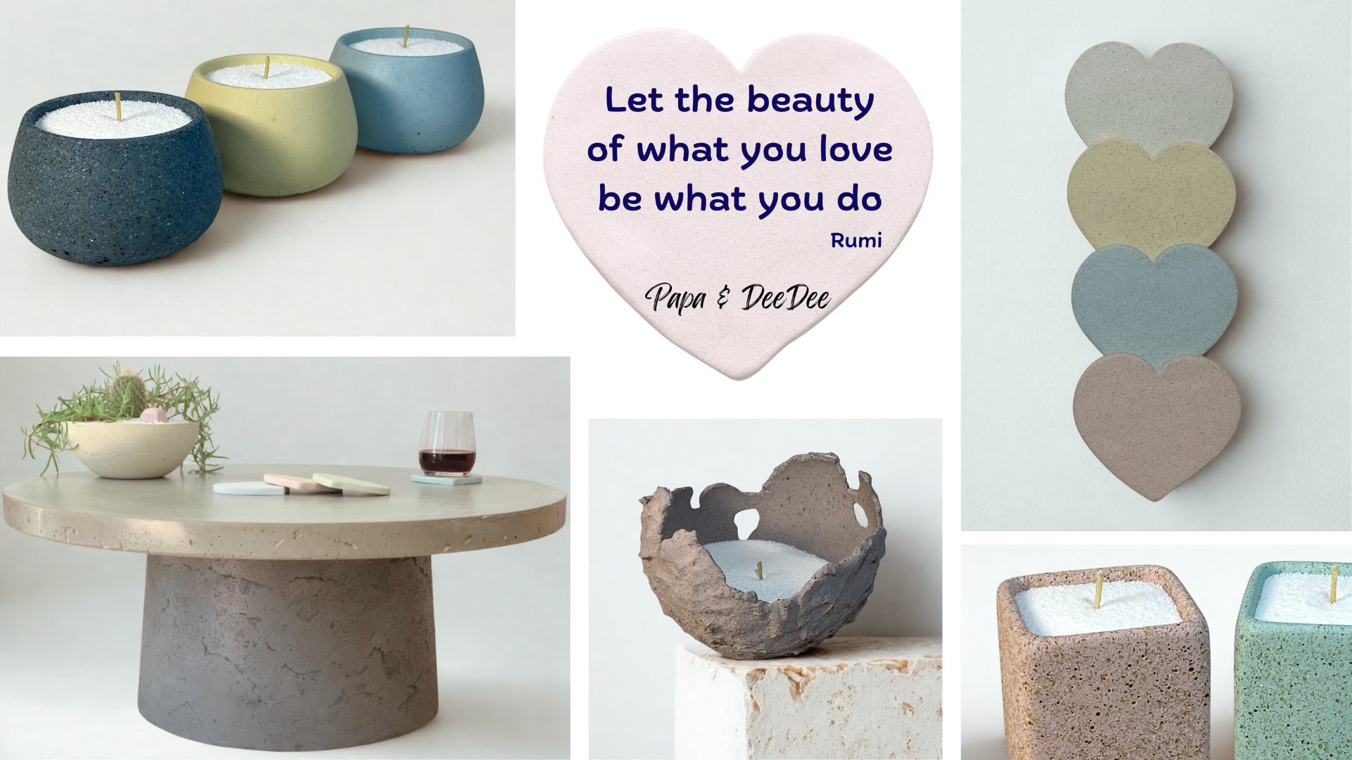 Papa & DeeDee creates beautiful, design-led pieces hand crafted from our own eco-friendly concrete blends. We blend creativity with sustainable materials to bring you modern, refined forms that feel natural and timeless. Thoughtfully made, responsibly produced, and designed to elevate every space.