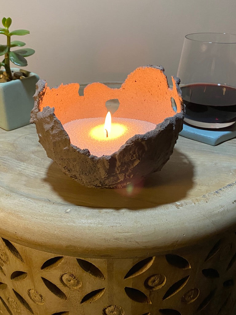 The surface is gently etched to expose the raw textures of the recycled elements beneath, giving every Hatchling its own quiet personality, while the carved shapes around the bowl allow candlelight to spill through and dance across nearby walls. Carefully sealed on the inside with food-safe natural oils and waxes, each Hatchling feels both ancient and purposeful. A small, sculptural bowl ready to cast a warm, flickering glow in any space.